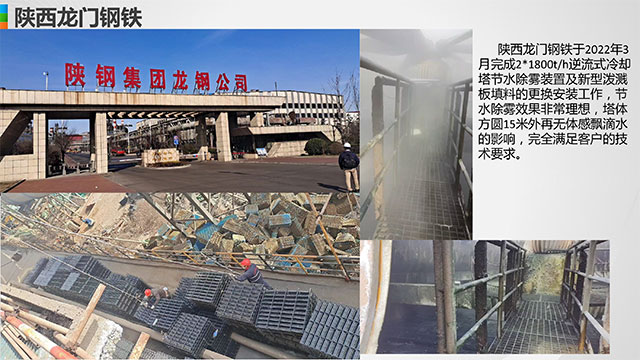陜西龍門(mén)鋼鐵于2022年3月完成2*1800t/h逆流式冷卻塔節水除霧裝置及新型潑濺板填料的更換安裝工作,節水除霧效果非常理想,塔體方圓15米外再無(wú)體感飄滴水的影響,完全滿(mǎn)足客戶(hù)的技術(shù)要求。